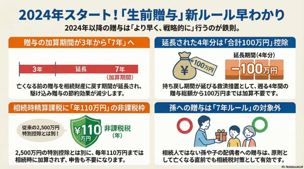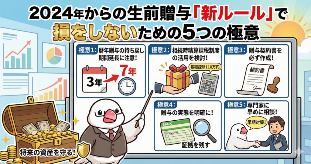 2024年の改正で、生前贈与はより「計画性」が求められるようになったよ。昔のやり方にこだわらず、新しい制度を賢く組み合わせることが、大切な財産を次の世代に笑顔でつなぐコツなんだ。
