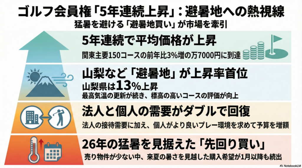 かつてのゴルフ会員権は、値上がり益を狙う投資対象だったけれど、今は「過酷な夏をいかに快適に過ごすか」という体験や環境への投資に変わっているヨ。都心の猛暑から逃れ、標高の高いグリーンで爽快にショットを打つ……その「権利」が今の市場で最も価値があるものなんだ。