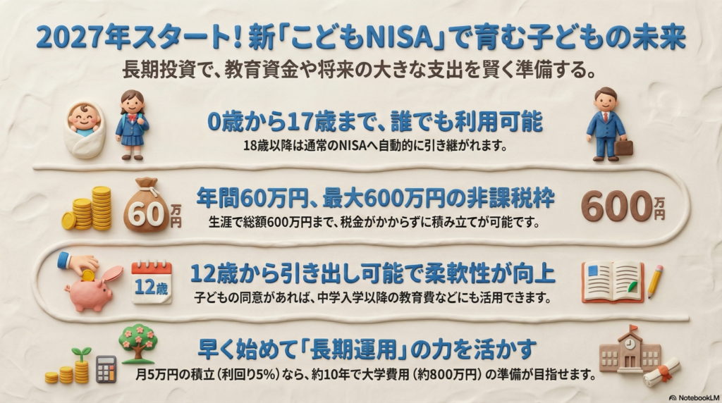2027年から0歳から17歳もNISAが使え、教育資金の準備がしやすくなります。