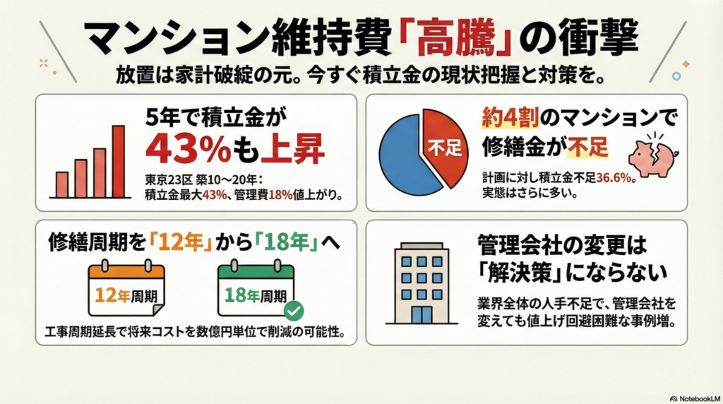 まず衝撃的な事実からお伝えします。私たちが毎月支払っているマンションの維持費が、このわずか5年で2〜4割も値上がりしているという調査結果があるんです。