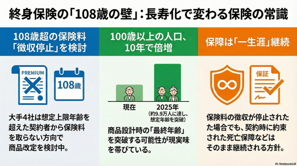 寿命が想定を超え、大手生保が108歳以上の終身保険料の徴収停止を検討し始めました。