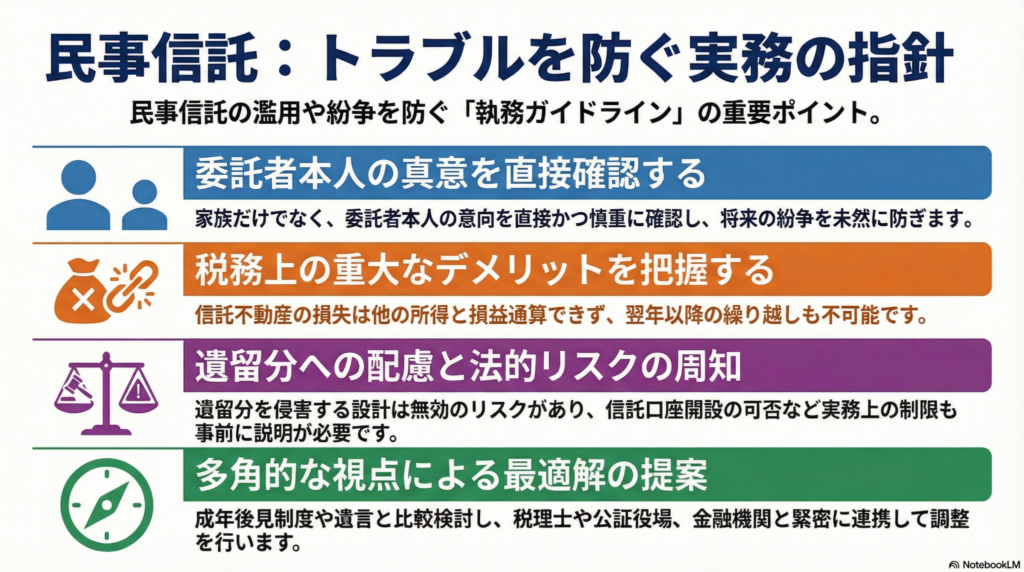 この言葉は、民事信託が紛争や不正利用につながる「悪い子」にならないよう、専門家、そして社会全体で守り育てていく必要があるというメッセージです。制度のメリットだけを強調して安易に利用するのではなく、その本質を理解し、依頼者の意思を実現する「良い子」として活用していく責務があるのです。