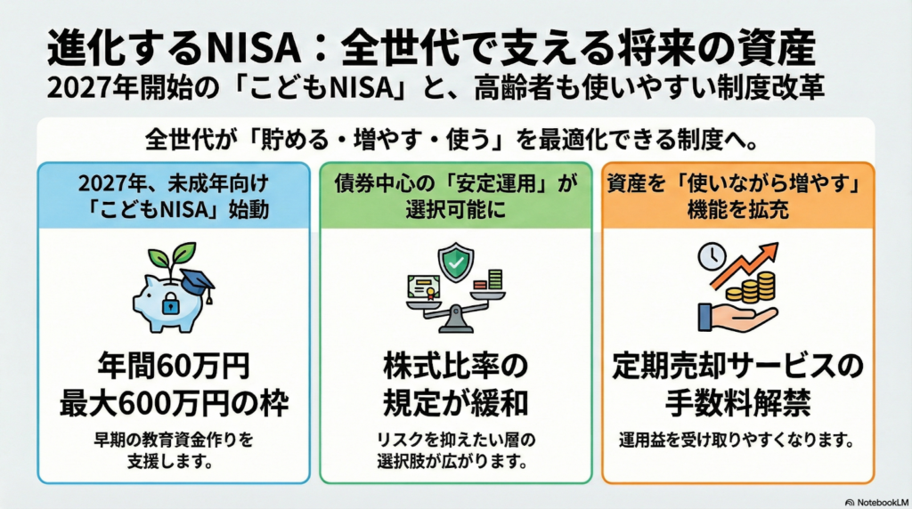 2024年に始まった新しいNISAは、多くの人々の資産形成の強力な味方として注目を集めています。しかし、その進化はまだ止まりません。NISAは、人生の始まり(こどもNISA)から、安定運用期(債券投信)、そして資産活用期(定期売却)まで、あらゆるステージを支える生涯の資産パートナーへと進化を遂げようとしています。