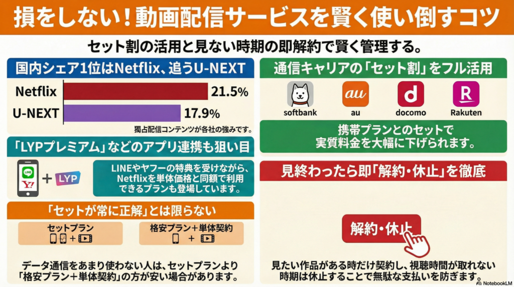 動画配信は観たい時だけ契約し、見終わったら即解約するのが家計を守る鉄則です。セット割は一見お得ですが、自分の通信量に合わないと逆に高くなるので注意が必要です。