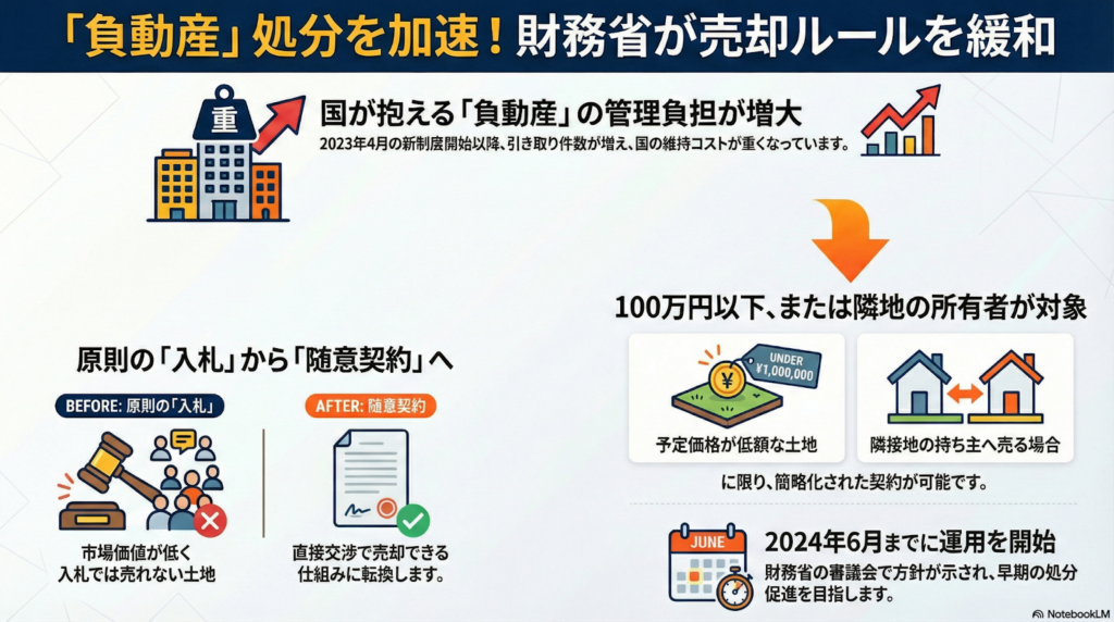 財務省は国が持つ売れにくい土地を、入札なしで直接売れるようルールを変えました。