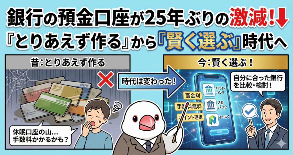 昔はお祝い事があるたびに新しい銀行口座を作ったり、就職や引っ越しのたびに増やしたりするのが当たり前でした。でも最近、使わなくなった口座をわざわざ解約して整理する人が増えているんです。「なんとなく持っている」ことが当たり前だった銀行口座に、今、大きな変化が起きています。なぜ私たちの身近にある口座がこれほどまでに減っているのか、その理由を一緒に見ていきましょう。