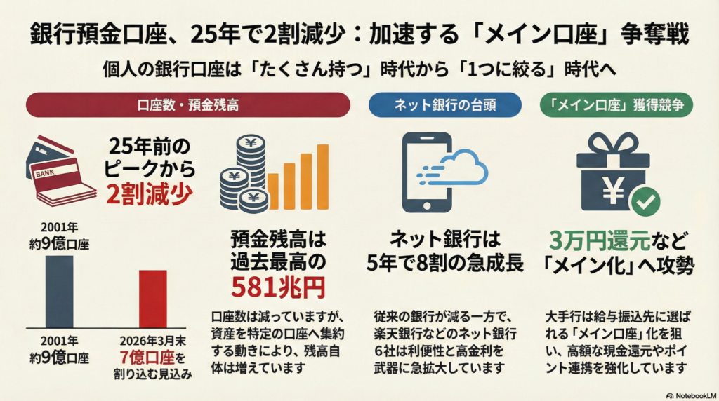 銀行口座が年度内に7億を下回る見通し。25年前のピークから2割も減っています。 無駄な口座を整理して、ポイントや特典が多いメイン口座に絞る動きが加速しています。