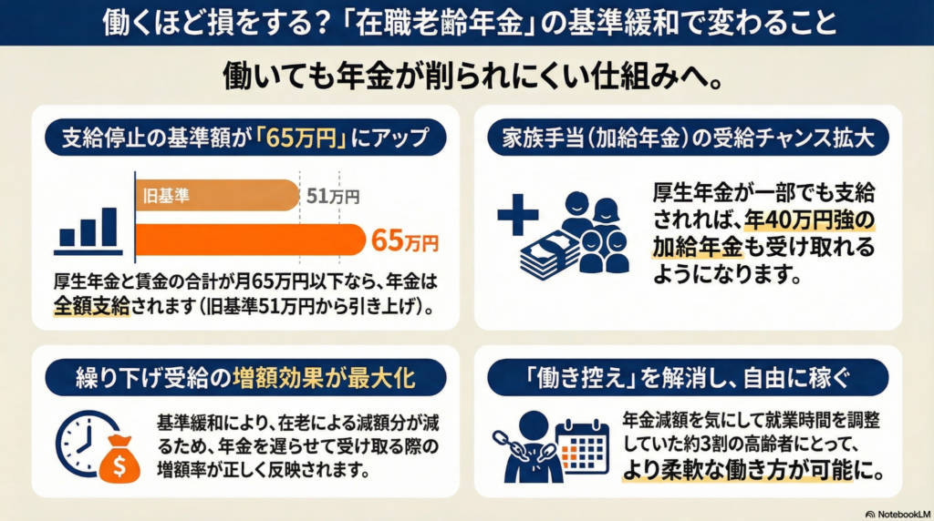 4月から年金が削られる基準が65万円に緩和され、働く高齢者の手取りが増えます。