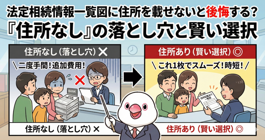 こんにちは!相続専門の文鳥、ぶん吉です(ちゅいヨ!)。 相続の手続きを劇的に楽にしてくれる「法定相続情報一覧図」。いざ作ろうとすると、相続人の住所を「載せるか・載せないか」という選択肢が出てくるんだ。実は、ここで「空欄」を選ぶと、後から「結局、住民票を取りに行く羽目になった!」なんて泣き言をいう羽目になることも多いんだよ。今日は、賢い選択基準をボクが分かりやすく伝授するちゅい!
