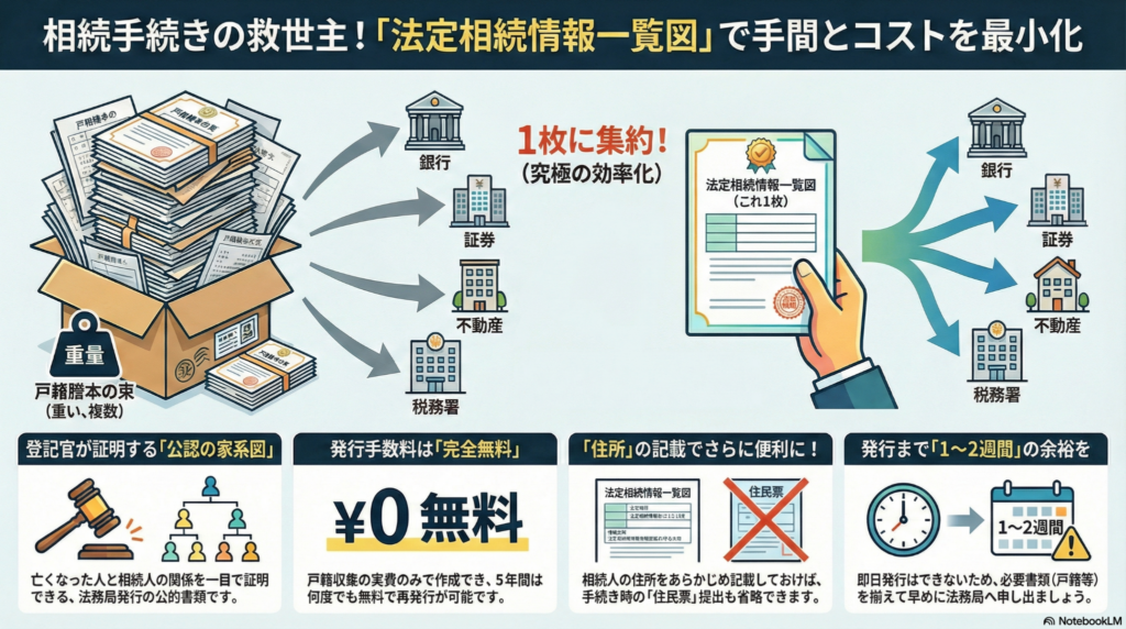 まずは基本をおさらいだね。この制度は、大量の「戸籍謄本の束」を何度も持ち歩かなくて済むように、法務局が相続関係を一枚の紙で証明してくれる便利なものなんだ。