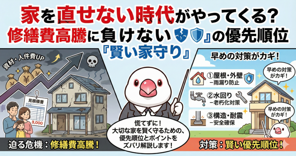 今、私たちの住まいを取り巻く環境はかつてないほど厳しくなっており、ごく普通の住まいを維持することさえ難しくなりかねない時代が到来しています。この記事では、修繕費高騰の背景を整理し、限られた予算で大切な家を守り抜くための「戦略的な優先順位」について詳しく解説します。