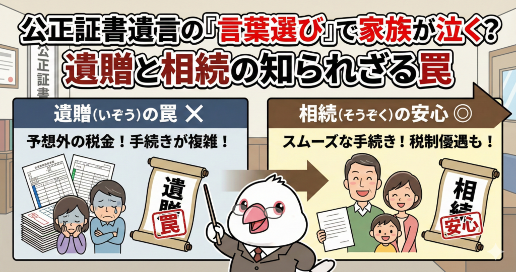 「公正証書で遺言を作ったから、もう安心だ」……そう思っている人は多いかもしれないけど、実は「たった数文字の言葉選び」が、家族を困らせる時限爆弾になることがあるんだちゅい。法律の世界では、日常会話の「あげる」でも、選ぶ言葉によって手続きの難易度や税金の額がガラッと変わっちゃうんだ。今日は、プロが教える「遺言書の罠」を徹底解説するちゅい!