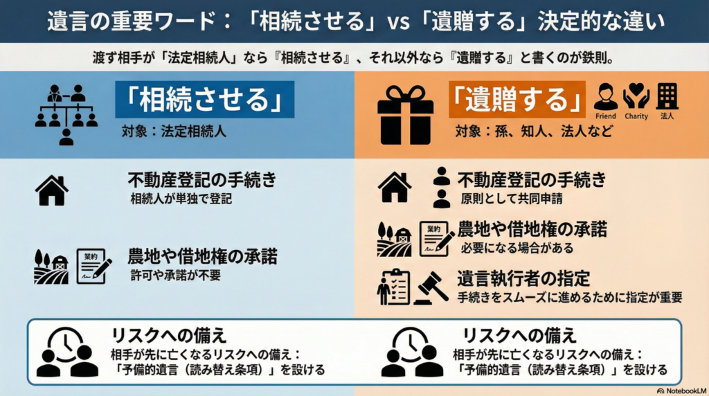 農地を相続人以外(孫など)に渡したい時、単に「この土地を遺贈する」という**「特定遺贈」にすると、農地法3条に基づく農業委員会の許可が必要になるんだ。農業をやっていない孫だと、許可が下りず名義変更できないリスクがあるちゅい。ところが、「財産の全部を遺贈する」といった「包括遺贈」**であれば、相続人以外であっても相続と同様に農地法の許可は不要になるんだ(ソース6)。言葉一つで許可の壁を越えられるかどうかが決まるんだちゅい!
