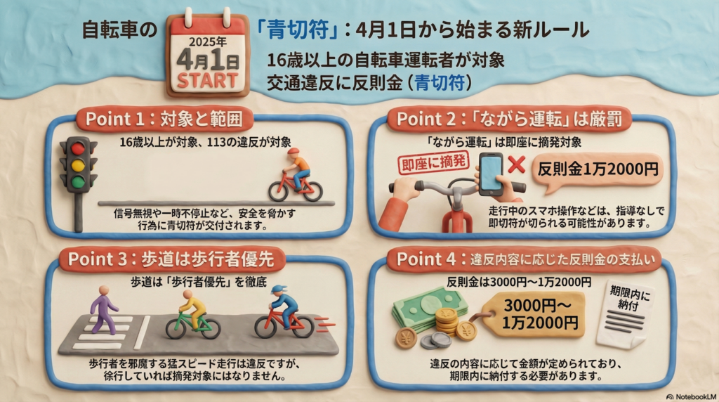 4月から16歳以上の自転車違反に青切符が導入され、反則金の対象になります。