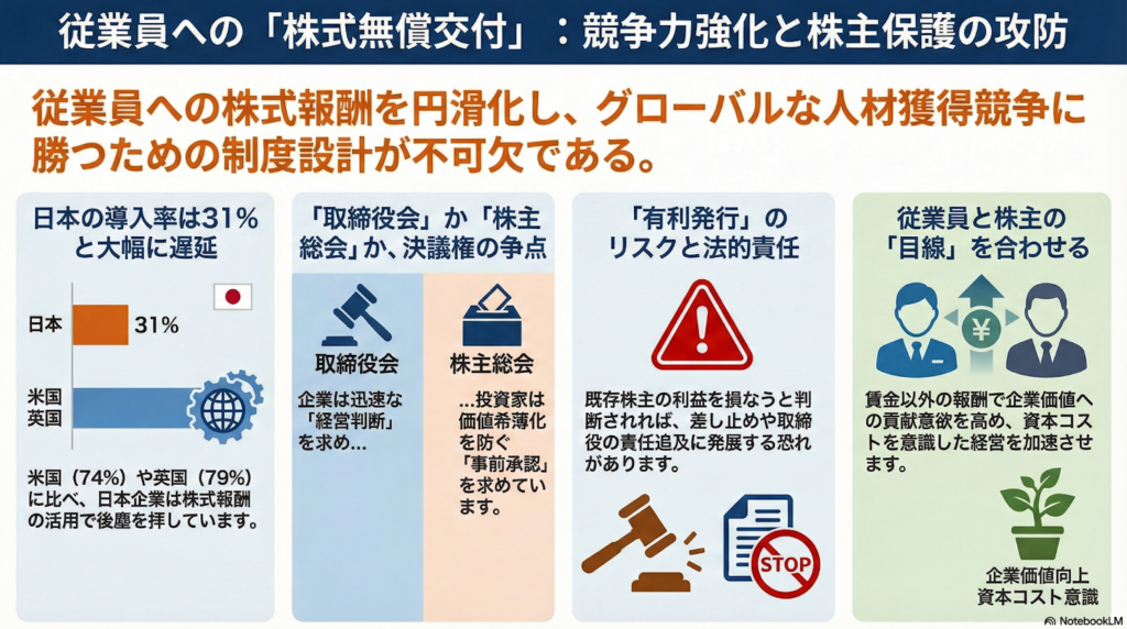 従業員への株式無償交付は、日本企業の競争力を高めるための重要な鍵となります。株主の権利保護と経営のスピード感をどう両立させるかが、制度設計の最大の争点です。