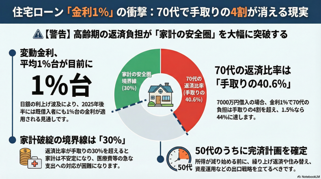住宅ローン金利が1%を超えると、高齢世代の生活は手取り収入の4割を返済に奪われ、家計は破綻するヨ。 収入が激減する60代以降に多額の返済を残さないよう、現役時代から「いつまでに完済するか」という精密な計画を立て直すことが、老後の平穏を守るための絶対条件だね。