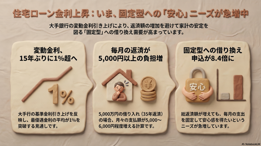 住宅ローンの変動金利が15年ぶりに1%を超え、毎月の返済額が増え始めています。 ・将来の負担増を避けるために、返済額が変わらない固定金利へ切り替える人が急増中です。
