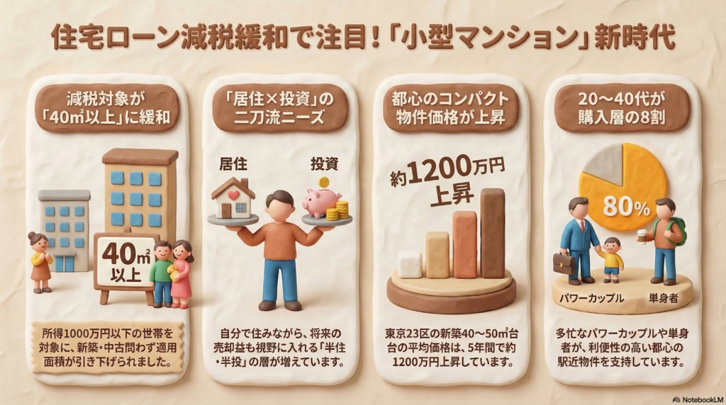 さらに重要なのが、当初2025年末までとされていたこの制度が、さらに5年間延長される方針であることです。この改正は、これまで「減税が受けられないから」と1LDKなどの小型物件を諦めていた方々にとって大きな追い風です。東京建物の矢島氏は、この制度改正について「単身者や共働き夫婦をターゲットにした間取りをより積極的に検討できる」と述べており、業界全体でも小型物件への期待が一段と高まっています。