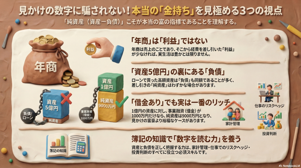 本当のお金持ちは、借金を差し引いた「純資産」の額で決まります。 年商の多さに惑わされず、手元に残る利益を見る力が大切ですよ。