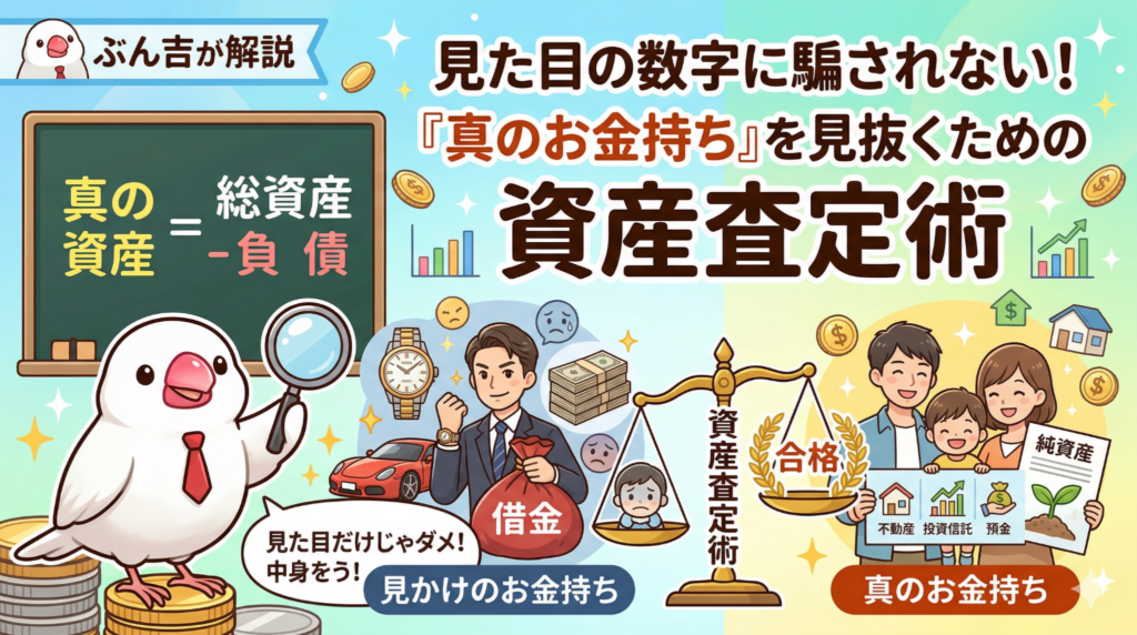 こんにちは!相続専門の文鳥、ぶん吉です(ちゅいヨ!)。世の中には「年商1億円」や「資産5億円」といった華やかな数字が溢れていますが、その数字だけで相手を判断するのはとても危険です。今日はお金の本質を見抜き、誰が一番の金持ちかを見分ける「資産査定」の極意を伝授するね。