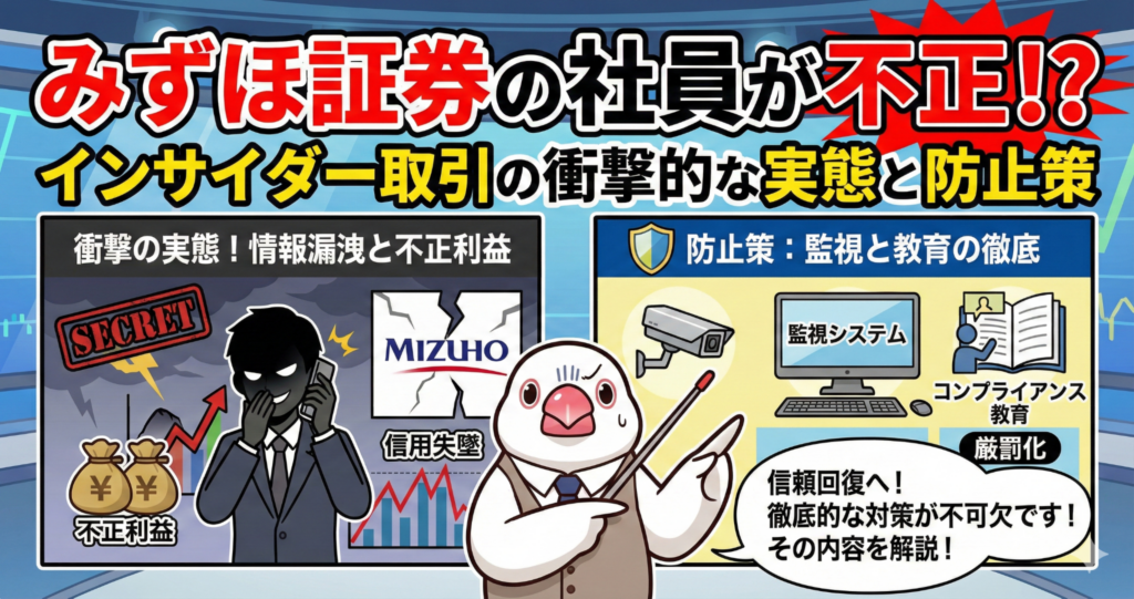 大手証券社員による「信頼の崩壊」 みずほ証券の「投資銀行部門」に所属する社員が、仕事で得た秘密の情報を悪用して株を売り買いする「インサイダー取引」を行った疑いで、証券取引等監視委員会の強制調査を受けました。