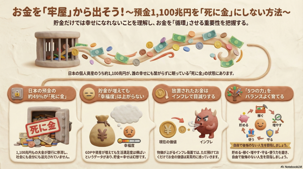 貯金だけでは幸せになれず、使わないお金は価値を失う「死に金」になるんだよ。
