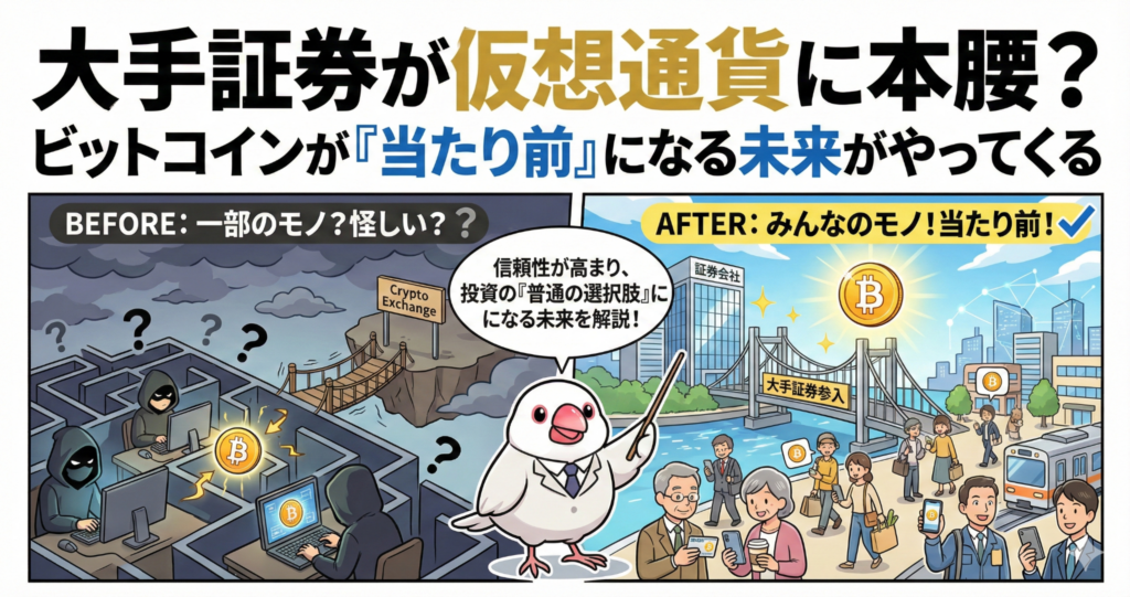 しかし今、その常識が塗り替えられようとしています。日本の金融界をリードする「大手証券会社」が、この分野に次々と本格参入を始めているのです。これまで一部の投資家だけのものだった仮想通貨が、私たちの身近な「当たり前の資産」になる日が、すぐそこまで来ています。