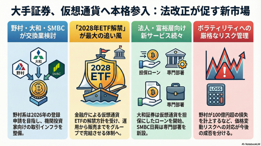 野村ホールディングスの子会社である「レーザー・デジタル」は、2026年中にも日本での暗号資産交換業の登録を目指しています。また、SMBC日興証券は2025年5月1日に仮想通貨関連の新規事業を開発する専門部署を新設し、参入の検討を始めました。大和証券グループも、グループ内での商品販売などを議論しています。