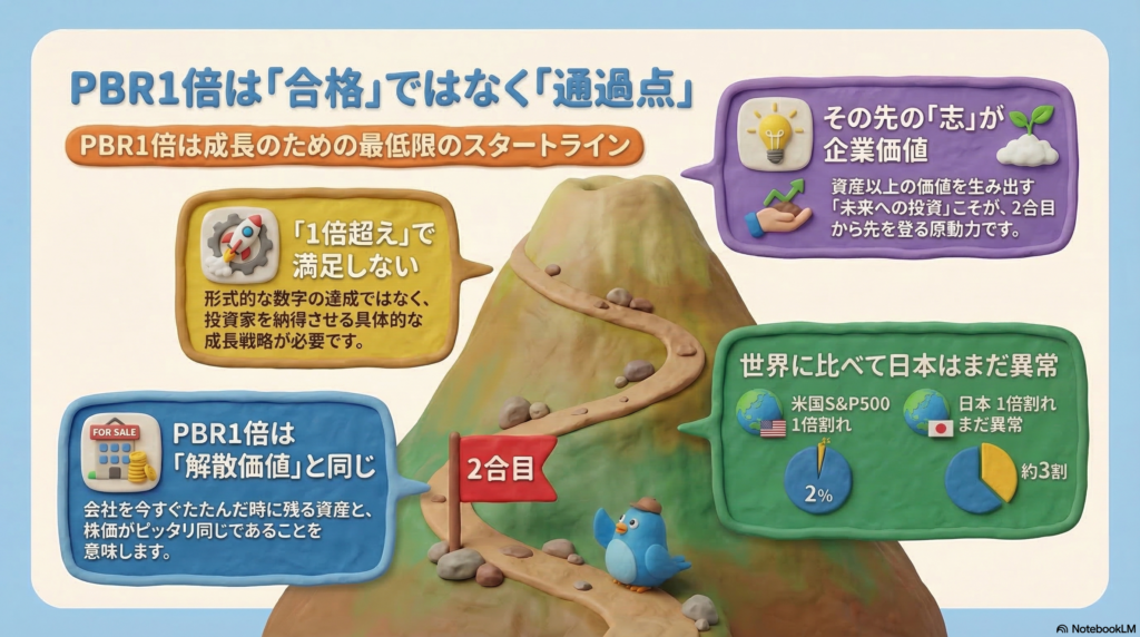 PBR1倍達成は経営の合格点ではなく、登山で言えば2合目にすぎない通過点です。 世界に比べ日本はまだ低評価。1倍超えの先にある成長戦略こそが投資家には重要です。