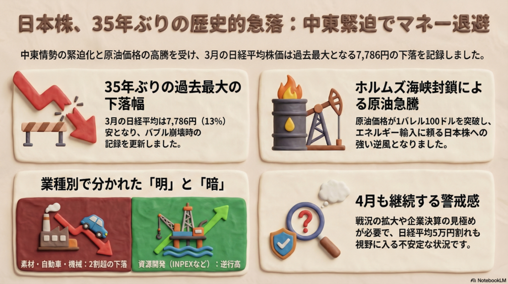 3月の投資の世界では、本当に驚くような出来事が起きました。日経平均株価が1ヶ月で7786円(13%)も値下がりし、これはバブル崩壊後の1990年以来、35年ぶりという歴史的な下げ幅になったのです。