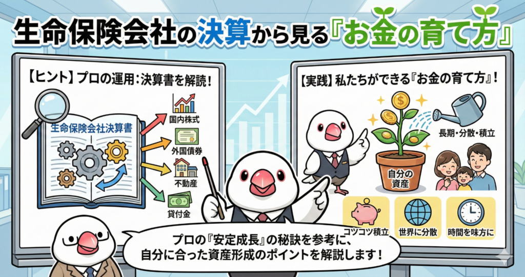 今回は、大手生命保険会社の最新の決算ニュースを読み解きながら、これからの「お金の育て方」について分かりやすく解説します。難しい数字の話も、インテリ文鳥の私と一緒に紐解いていきましょう。