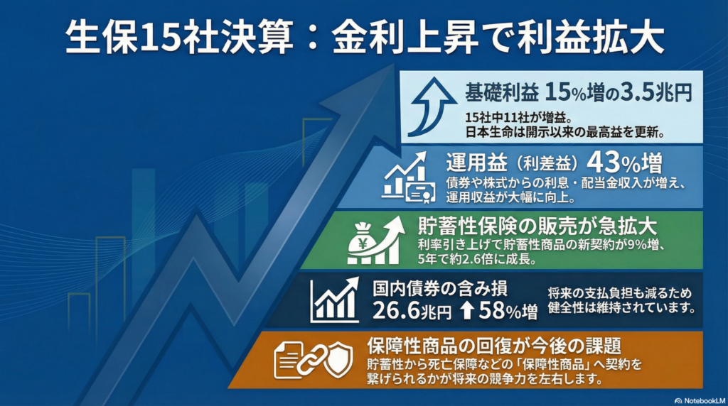 国内の主要な生命保険会社15社・グループの2024年度4〜12月期決算が出そろいました。その内容は、本業の儲けを示す「基礎利益」が前年同期比で__15%増の約3兆5000億円__という、非常に力強いものでした。