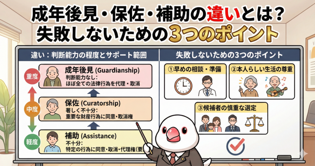 もし大切な家族の判断能力に不安を感じたら、どのタイプが一番合うと思いますか?早めに準備を始めることが、家族みんなの笑顔を守ることにつながるちゅいヨ。