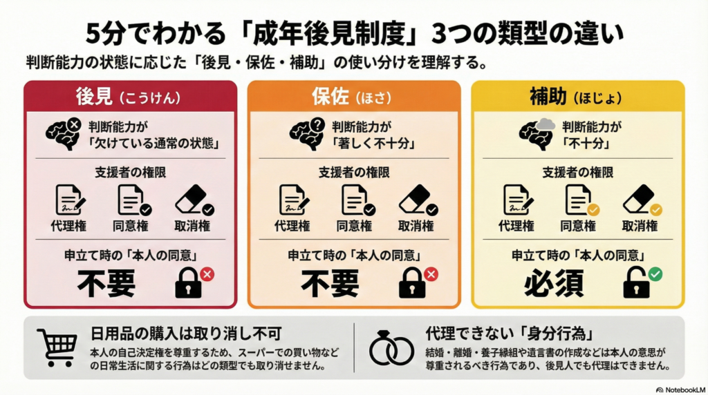 なぜこのような違いがあるかというと、「まだ自分自身の力でできることが残っている人」の意思を最大限に尊重するためなんだ。残っている能力(残存能力)を活かし、本人が自分らしく暮らしていくためのハードルにならないよう、慎重に設計されているんだね。