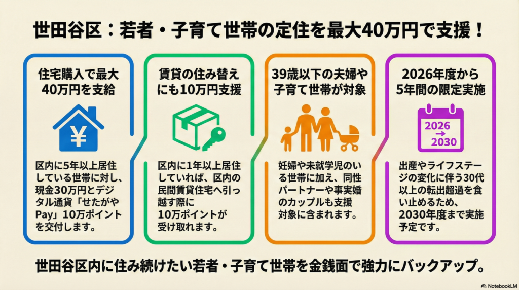 住宅購入の補助金は他の自治体でもたまにあるけれど、賃貸の住み替えにまで10万円分もの支援が出るのは全国的にも珍しいんだよ。賃貸派の家族にとっても、世田谷に住み続けるための大きな後押しになる、すごく親切な制度だよね。
