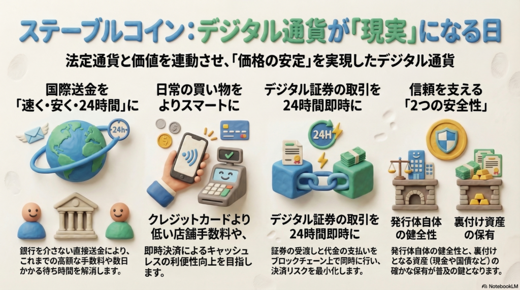 ステーブルコインは、クレジットカードやQRコード決済に代わる新しい支払い手段としても期待されています。