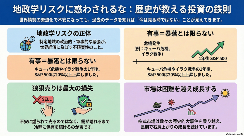 これまでの内容をまとめると、地政学的な事件が起きたからといって必ずしも株価が暴落するわけではなく、むしろ上昇するケースも多々あるということです。大切なのは、メディアの煽りや根拠のない不安に駆られて「狼狽売り」をしないこと。市場の不屈の成長力を信じて、冷静に投資を継続しましょう。