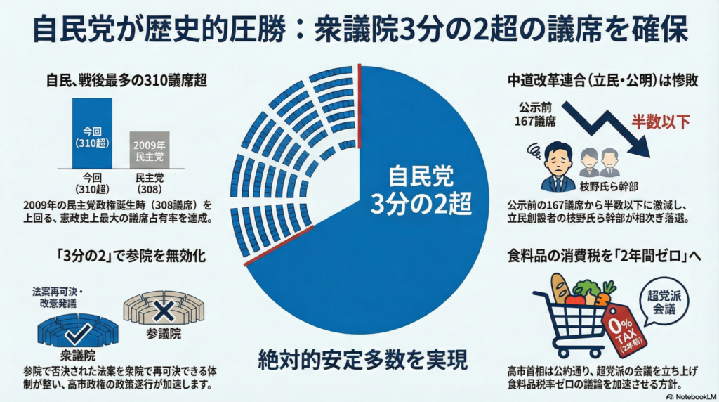 自民党が衆議院の3分の2を超える議席を獲得し、歴史的な圧勝を収めました。これにより、参議院で反対された法律も衆議院で再び決めて成立させることが可能です。