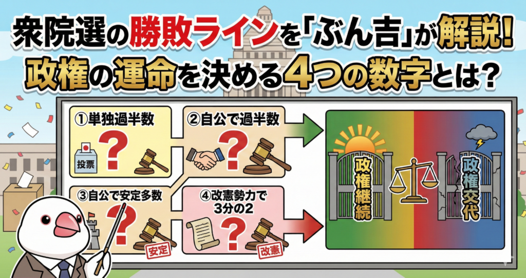 こんにちは!相続専門の文鳥、ぶん吉です(ちゅいヨ!)。 今日はニュースでよく聞く「衆議院選挙」について、ボクと一緒に勉強していきましょう。政治の話って難しそうに見えるけど、実は「数字」に注目するととってもわかりやすくなるんだよ。難しいニュースを、文鳥のボクが優しく紐解いてあげるから安心してね。
