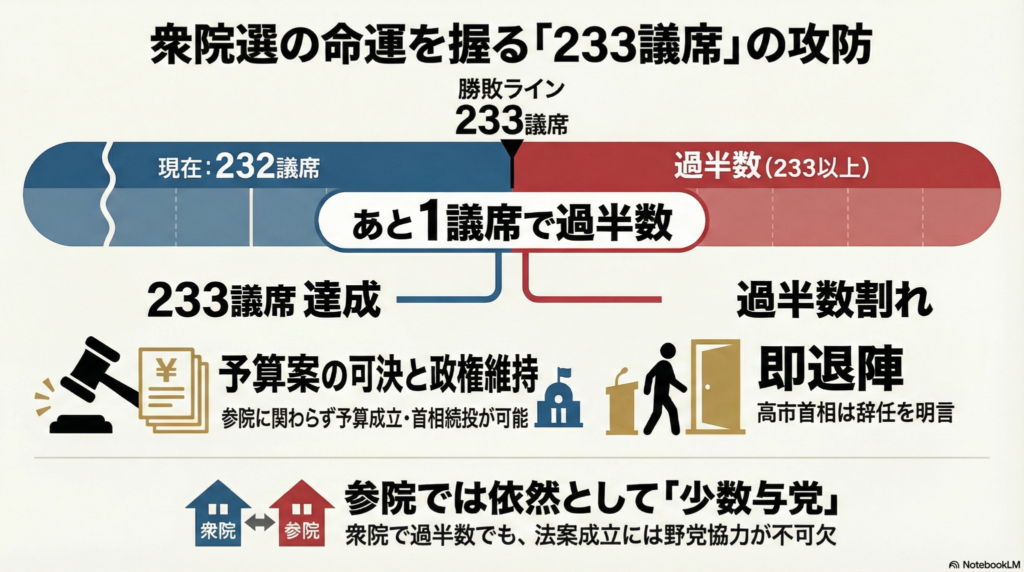 自民党の高市首相は、与党で過半数の233議席を維持できるかが最大の勝負所です。