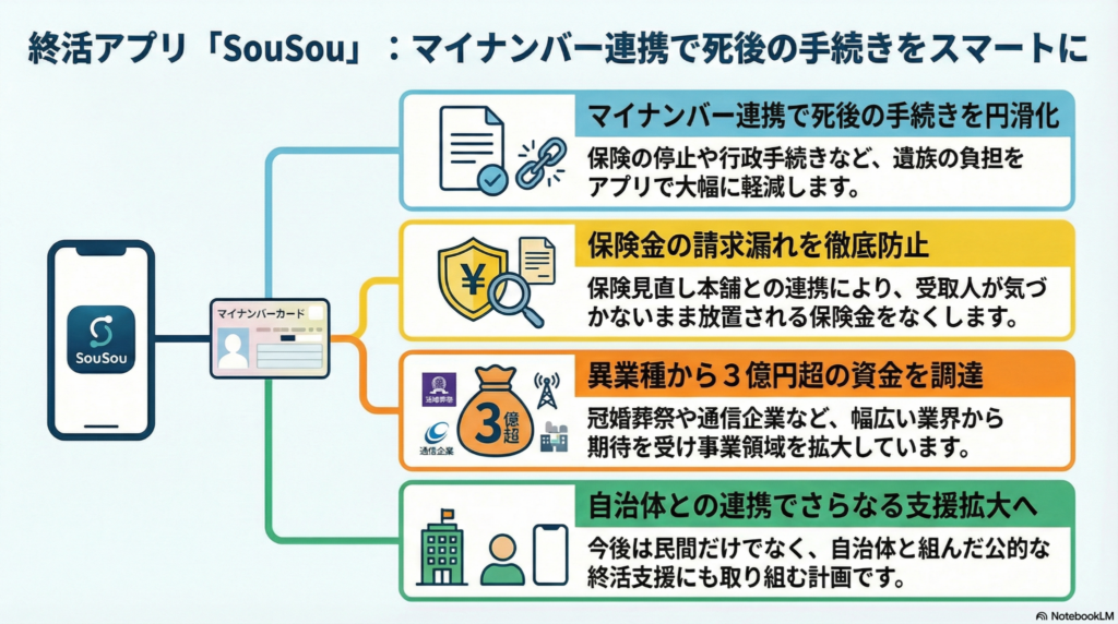 今回は、マイナンバーカードを活用して死後の手続きを助けるアプリ「SouSou」についてお伝えしました。3億円以上の資金調達を背景に、保険の請求漏れ防止や自治体との連携など、終活の形は今、デジタルの力で劇的に変わろうとしています。