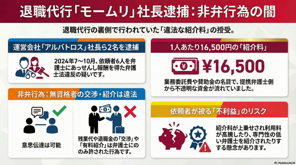 「会社を辞めたいけれど、怖くて言い出せない……」。そんな切実な悩みに寄り添い、24時間対応や4万件以上の実績で急成長したのが退職代行サービス「モームリ」です。しかし、運営会社「アルバトロス」の社長らが逮捕されたというニュースは、多くの利用者に大きな衝撃を与えました(ちゅい!)。