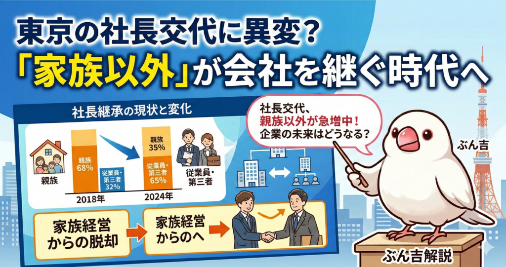 でも、実は今、東京都内では少しずつ状況が良い方向へ変わってきているんだ。今回は、5万4135社という、とってもたくさんの会社を対象にした最新データをもとに、日本の会社がどうやって新しいリーダーを選ぼうとしているのか、その変化を一緒に見ていこう!