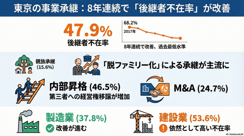 東京都内の後継者不在率は47.9%まで低下し、8年連続で改善が進んでいます。 親族が継ぐ形から、社員の昇格やM&Aといった「脱ファミリー化」が加速しています。