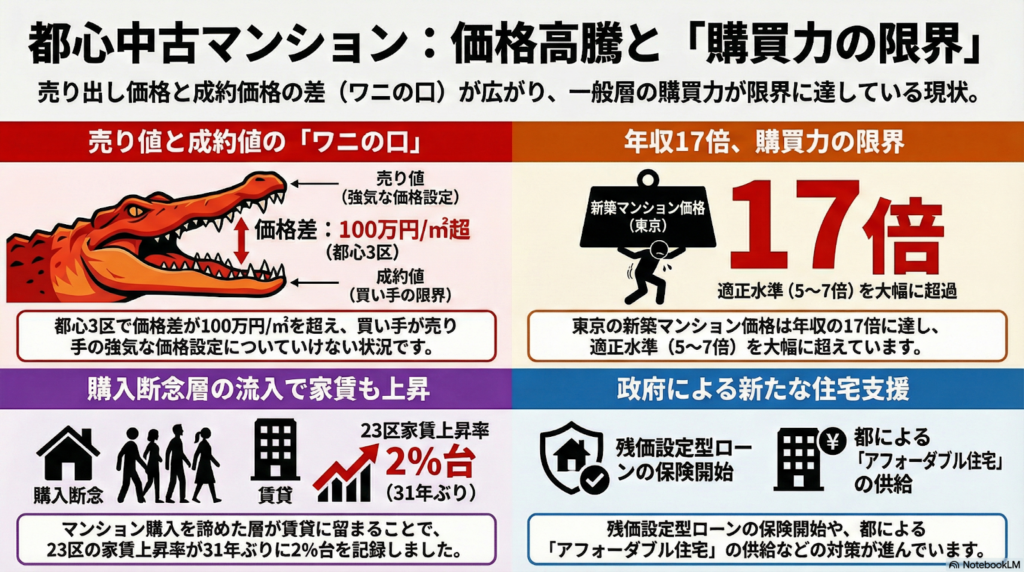 売り出し価格と成約価格の差が「ワニの口」のように開く状況は、投資目的ではなく自ら居住するために買う実需層の購買力が限界に近づきつつある状況を映す。
