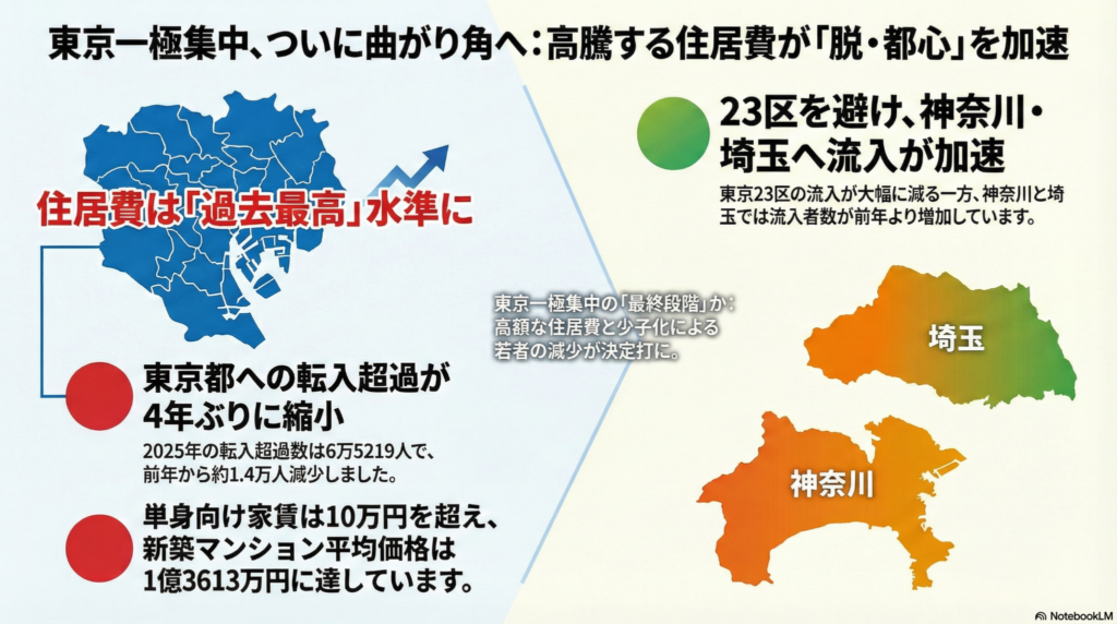 東京都心への一極集中が4年ぶりに鈍化。要因は高騰しすぎたマンション価格と家賃です。 23区を避け埼玉や神奈川へ流入。若者や高齢者が「コスト高な東京」を敬遠し始めました。