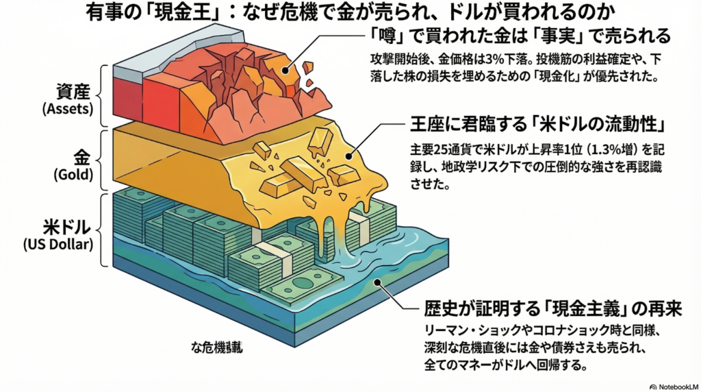 その理由は「キャッシュ・イズ・キング(現金は王様)」という言葉に集約されます。 市場がパニックになると、投資家にとって最も大切なのは「流動性」、つまり「いつでも、どこでも、すぐ支払いに使えること」になります。